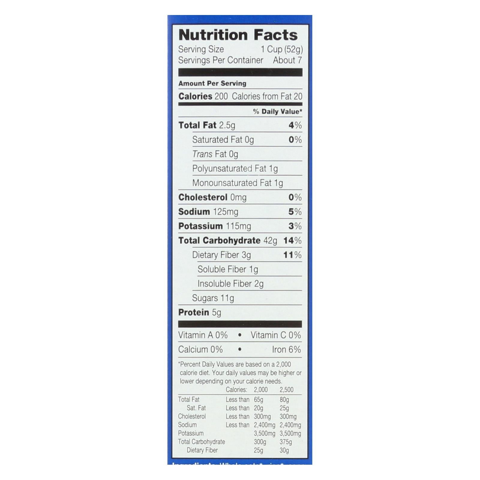 ingredients : whole oats* rice;cane syrup;blueberry granola cluster;rolled oats;dried cane syrup;brown rice syrup;whole oat flour;brown rice flour;wild blueberries;expeller pressed canola oil;natural flavor;elderberry juice concentrate for color;rosemary extract for freshness;invert cane syrup;salt;baking soda;mixed tocopherols;vitamin e;for freshness