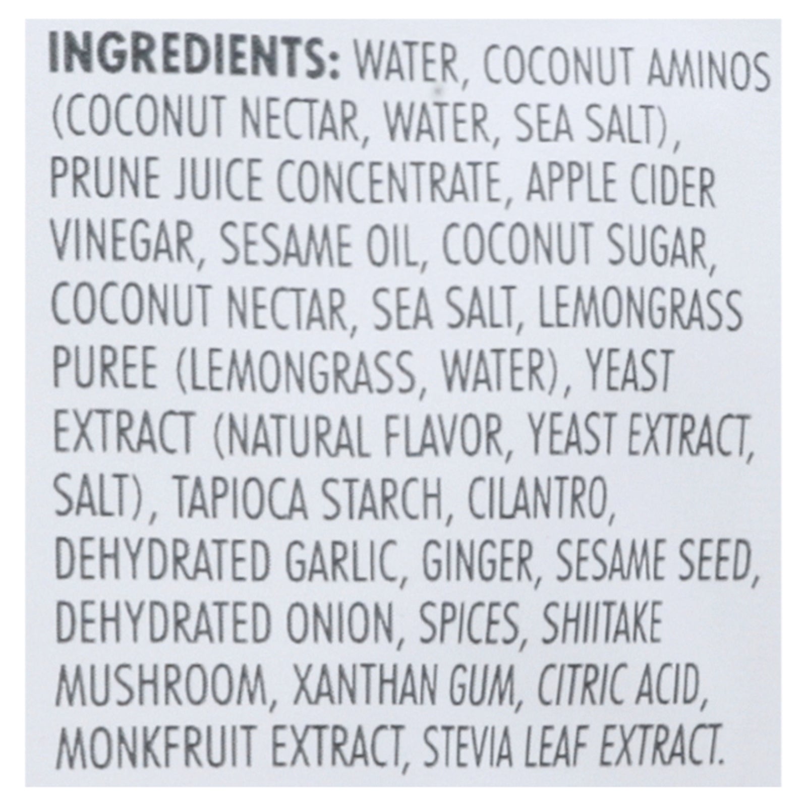 ingredients : water;coconut aminos;coconut nectar;sea salt;prune juice concentrate;apple cider vinegar;sesame oil;coconut sugar;lemongrass puree;lemongrass;yeast extract;natural flavor;salt;tapioca starch;cilantro;dehydrated garlic;ginger;sesame seed;dehydrated onion;spices;shiitake mushroom;xanthan gum;citric acid;monkfruit extract;stevia leaf extract