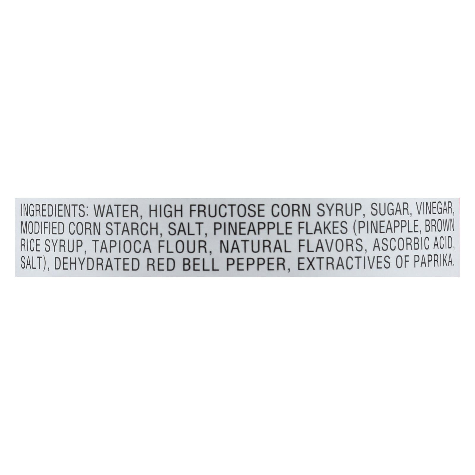 ingredients : water;high fructose corn syrup;sugar;vinegar;modified corn starch;salt;pineapple flakes (pineapple, brown rice syrup, tapioca flour, natural flavors, ascorbic acid, salt);dehydrated red bell pepper;extractives of paprika