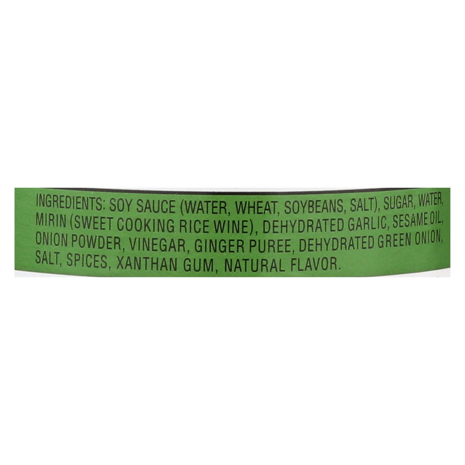 ingredients : soy sauce;water;wheat;soybeans;salt;sugar;mirin;sweet cooking rice wine;dehydrated garlic;sesame oil;onion powder;vinegar;ginger puree;dehydrated green onion;spices;xanthan gum;natural flavor
