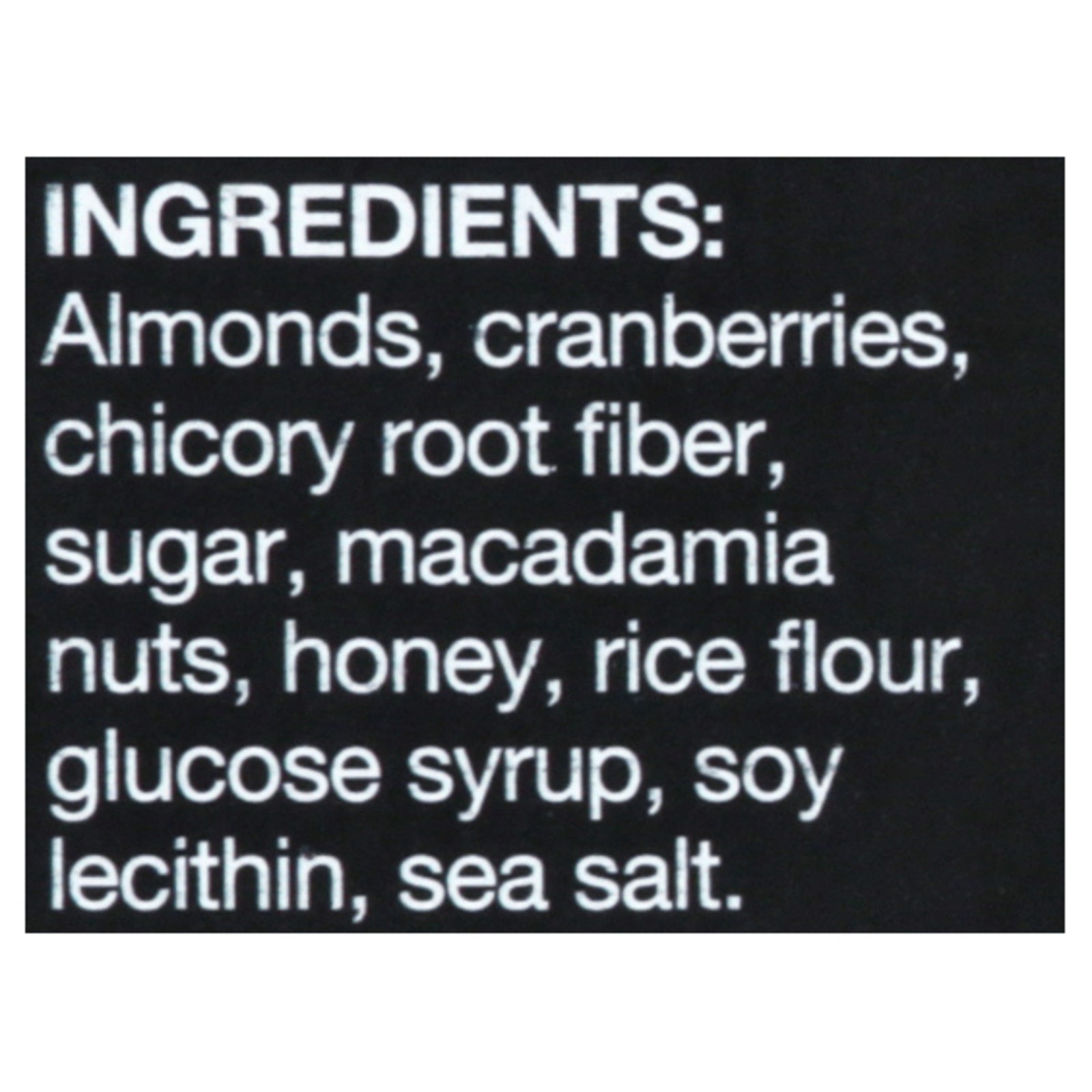 ingredients : almonds;cranberries;chicory root fiber;sugar;honey;rice flour;glucose syrup;soy lecithin;sea salt