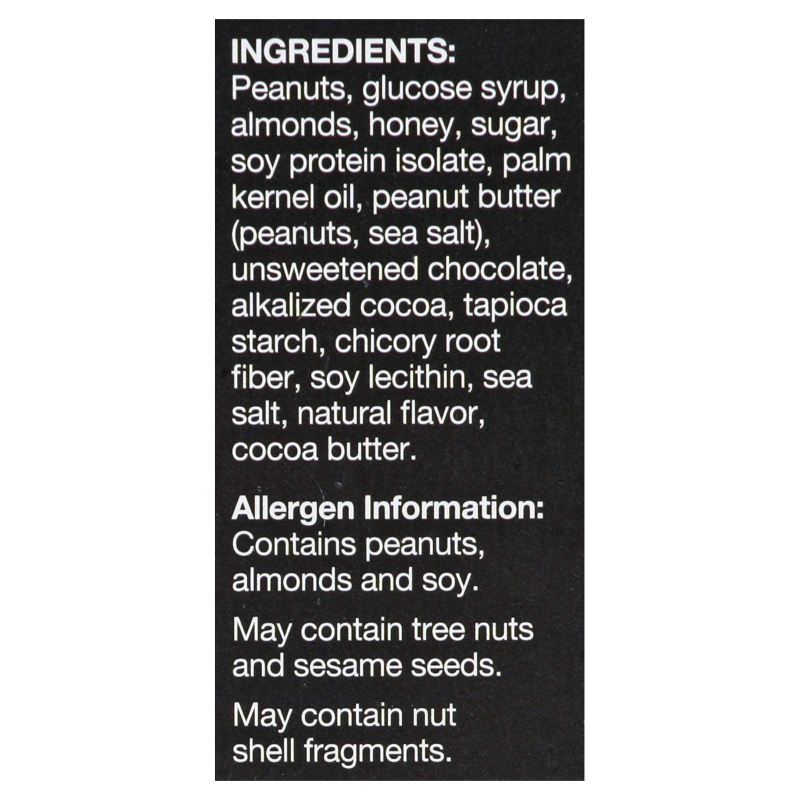 ingredients : peanuts;glucose syrup;almonds;honey;sugar;soy protein isolate;palm kernel oil;peanut butter (peanuts, sea salt);unsweetened chocolate;alkalized cocoa;tapioca starch;chicory root fiber;soy lecithin;sea salt;natural flavor;cocoa butter