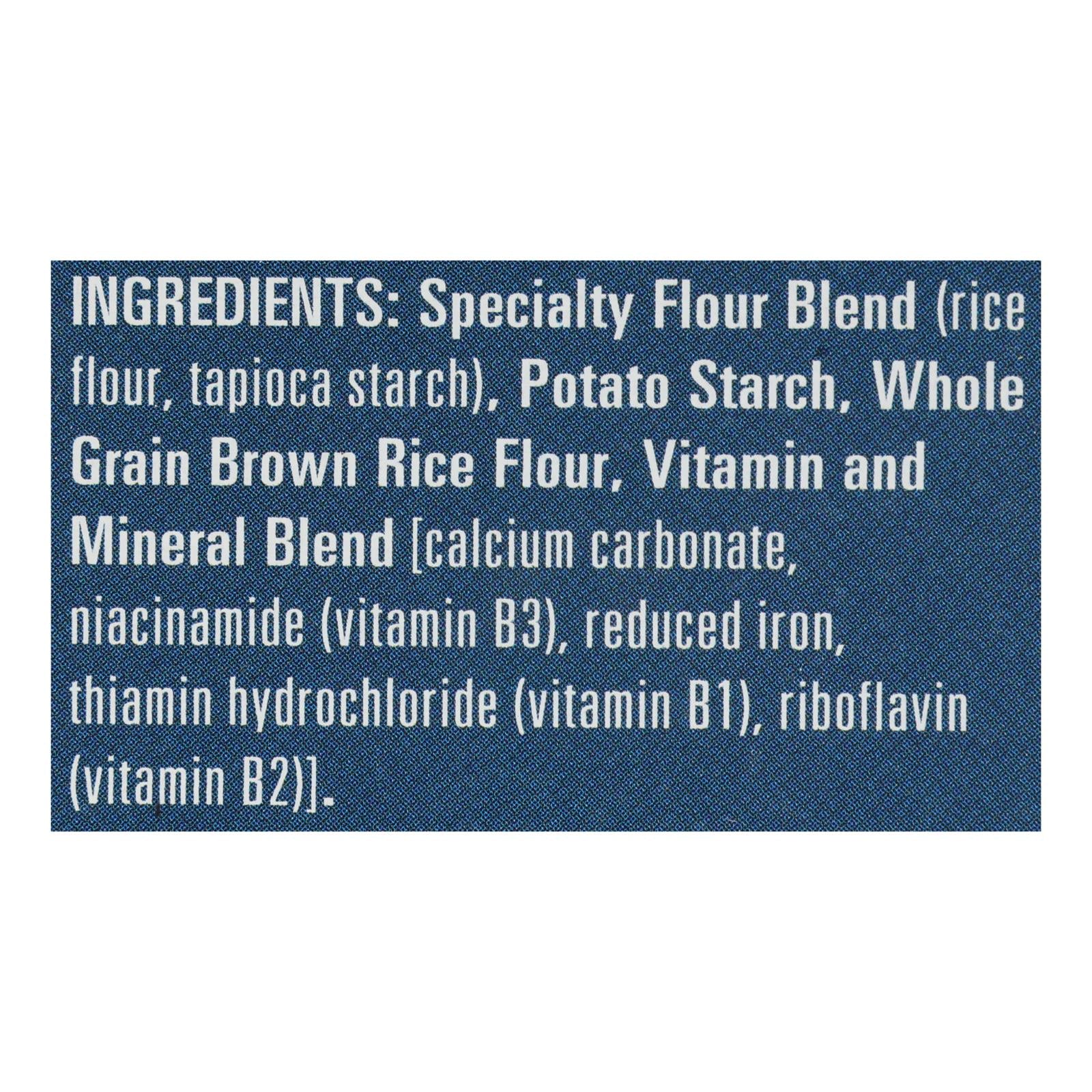 ingredients : specialty flour blend (rice flour, tapioca starch);potato starch;whole grain brown rice flour;vitamin and mineral blend [calcium carbonate, niacinamide (vitamin b3), reduced iron, thiamin hydrochloride (vitamin b1), riboflavin (vitamin b2)]