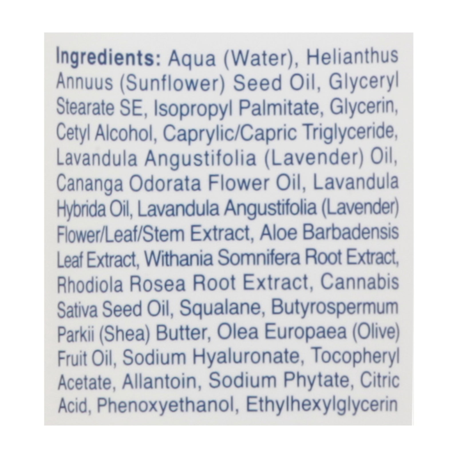 ingredients : aqua (water);helianthus annuus (sunflower) seed oil;glyceryl stearate se;isopropyl palmitate;glycerin;cetyl alcohol;caprylic/capric triglyceride;lavandula angustifolia (lavender) oil;cananga odorata flower oil;lavandula hybrida oil;lavandula angustifolia (lavender) flower/leaf/stem extract;aloe barbadensis leaf extract;withania somnifera root extract;rhodiola rosea root extract;cannabis sativa seed oil;squalane;butyrospermum parkii (shea) butter;olea europaea (olive) fruit oil;sodium hyaluronate