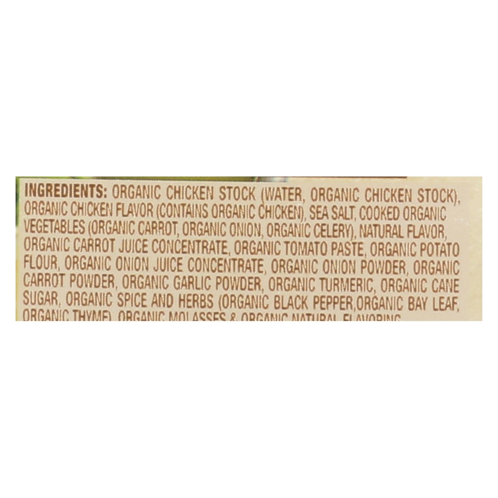 ingredients : organic chicken stock;water;organic chicken flavor;contains organic chicken;sea salt;cooked organic vegetables;organic carrot;organic onion;organic celery;natural flavor;organic carrot juice concentrate;organic tomato paste;organic potato flour;organic onion juice concentrate;organic onion powder;organic carrot powder;organic garlic powder;organic turmeric;organic cane sugar;organic spice and herbs;organic black pepper organic bay leaf;organic thyme;organic molasses & organic natural flavori