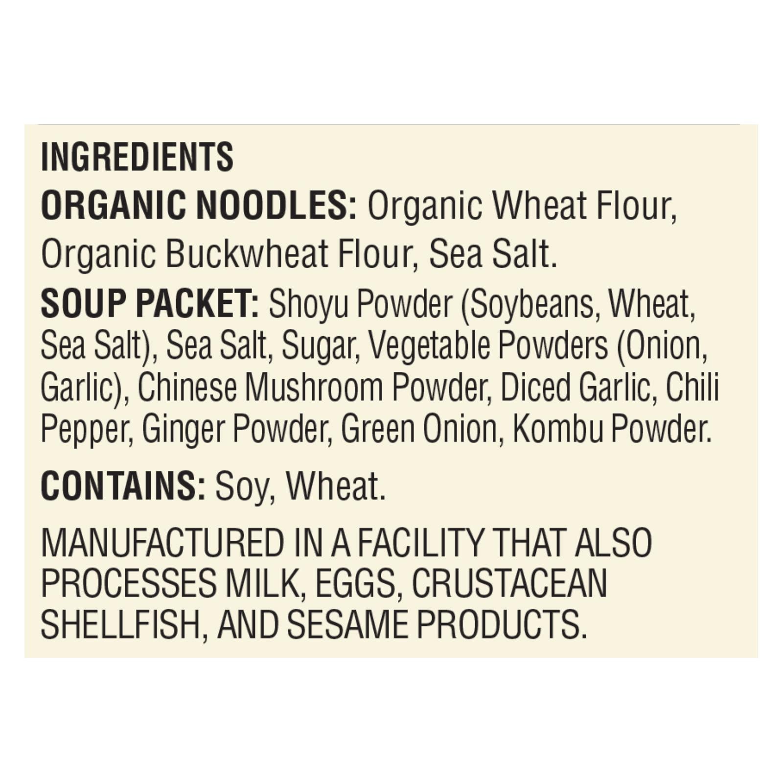 ingredients : organic noodles: organic heirloom wheat flour;organic heirloom buckwheat flour;sea salt;soup packet: shoyu powder;soybeans;wheat;natural sea salt;vegetable powders;onion;garlic;chinese mushroom powder;diced garlic;chili pepper;ginger powder;green onion;kombu powder