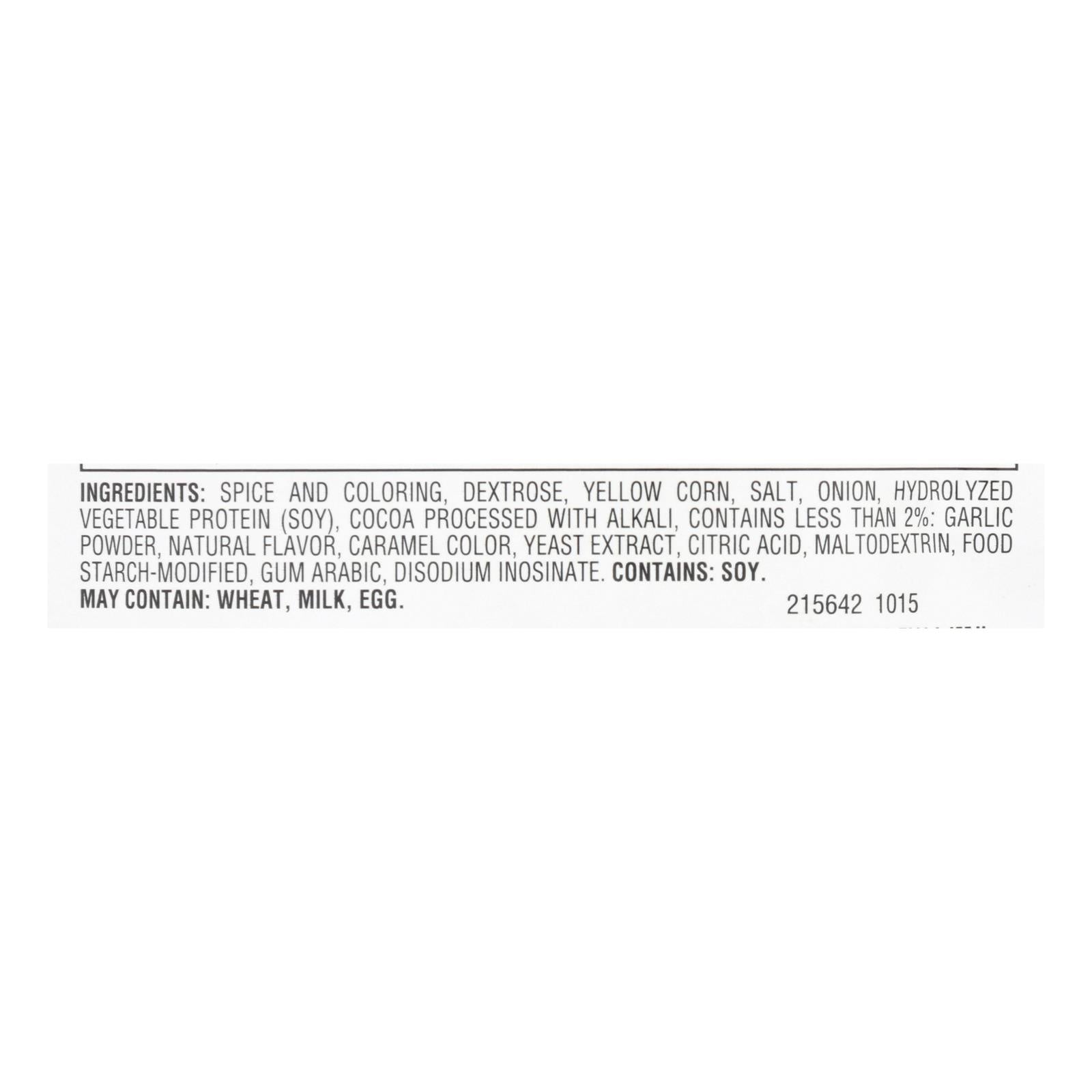 ingredients : spice and coloring;dextrose;yellow corn;salt;onion;hydrolyzed vegetable protein;soy;cocoa processed with alkali;contains less than 2%: garlic powder;natural flavor;caramel color;yeast extract;citric acid;maltodextrin;food starch-modified;gum arabic;disodium inosinate