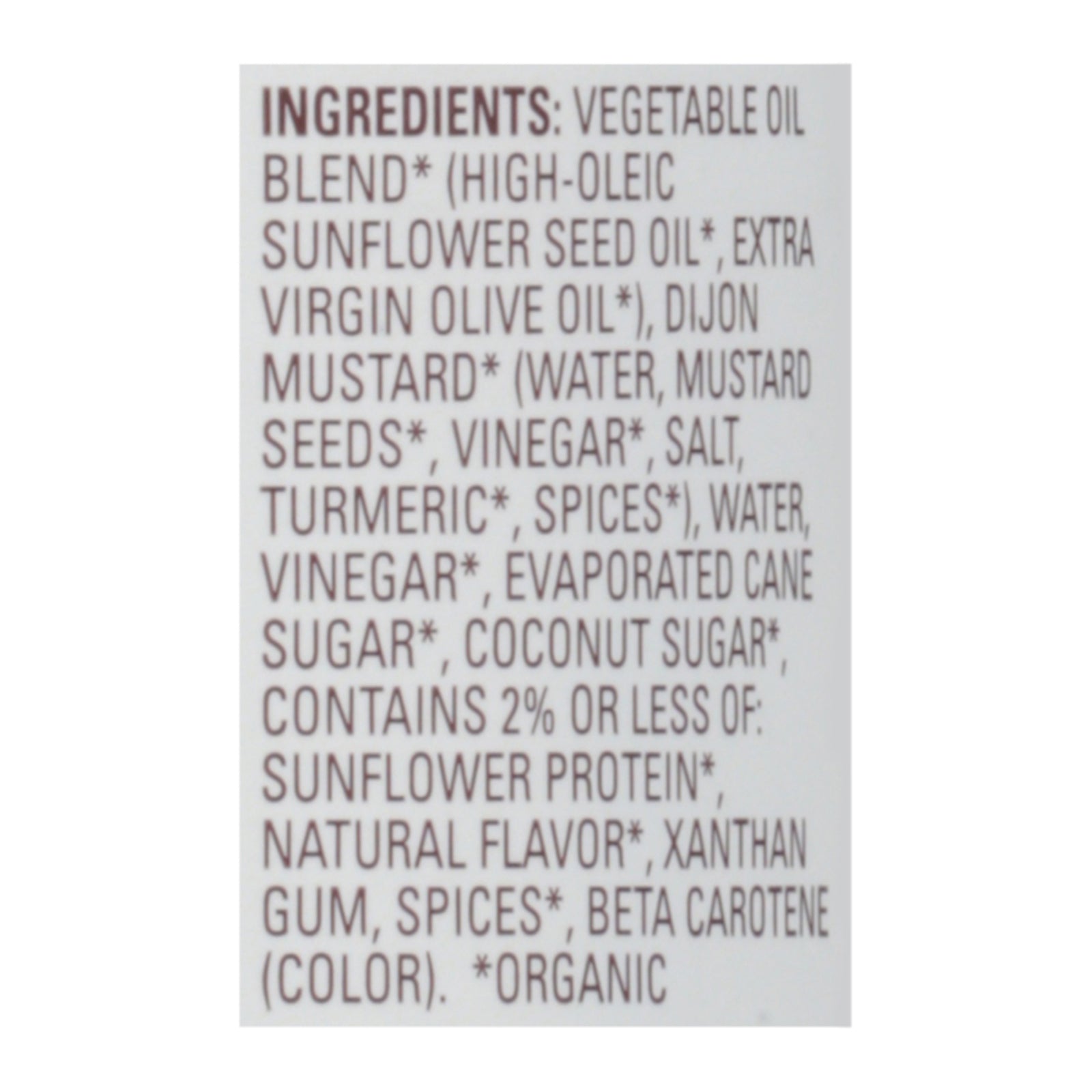 ingredients : vegetable oil blend* (high-oleic sunflower seed oil*, extra virgin olive oil*);dijon mustard* (water, mustard seeds*, vinegar*, salt, turmeric*, spices*);water;vinegar;evaporated cane sugar;coconut sugar;contains 2% or less of: sunflower protein*, natural flavor*, xanthan gum, spices*, beta carotene (color)