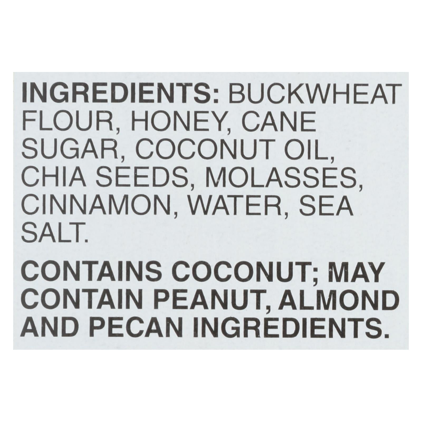 ingredients : buckwheat flour;honey;cane sugar;coconut oil;chia seeds;molasses;cinnamon;water;sea salt