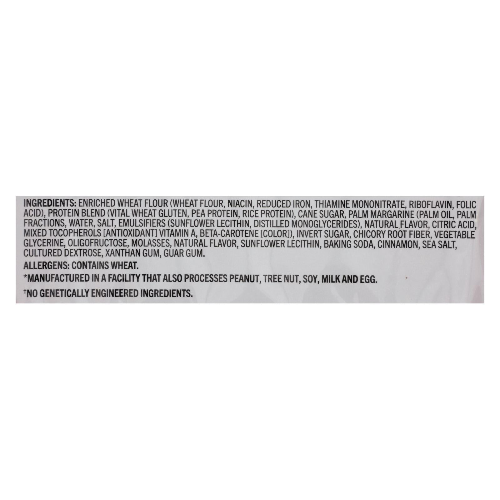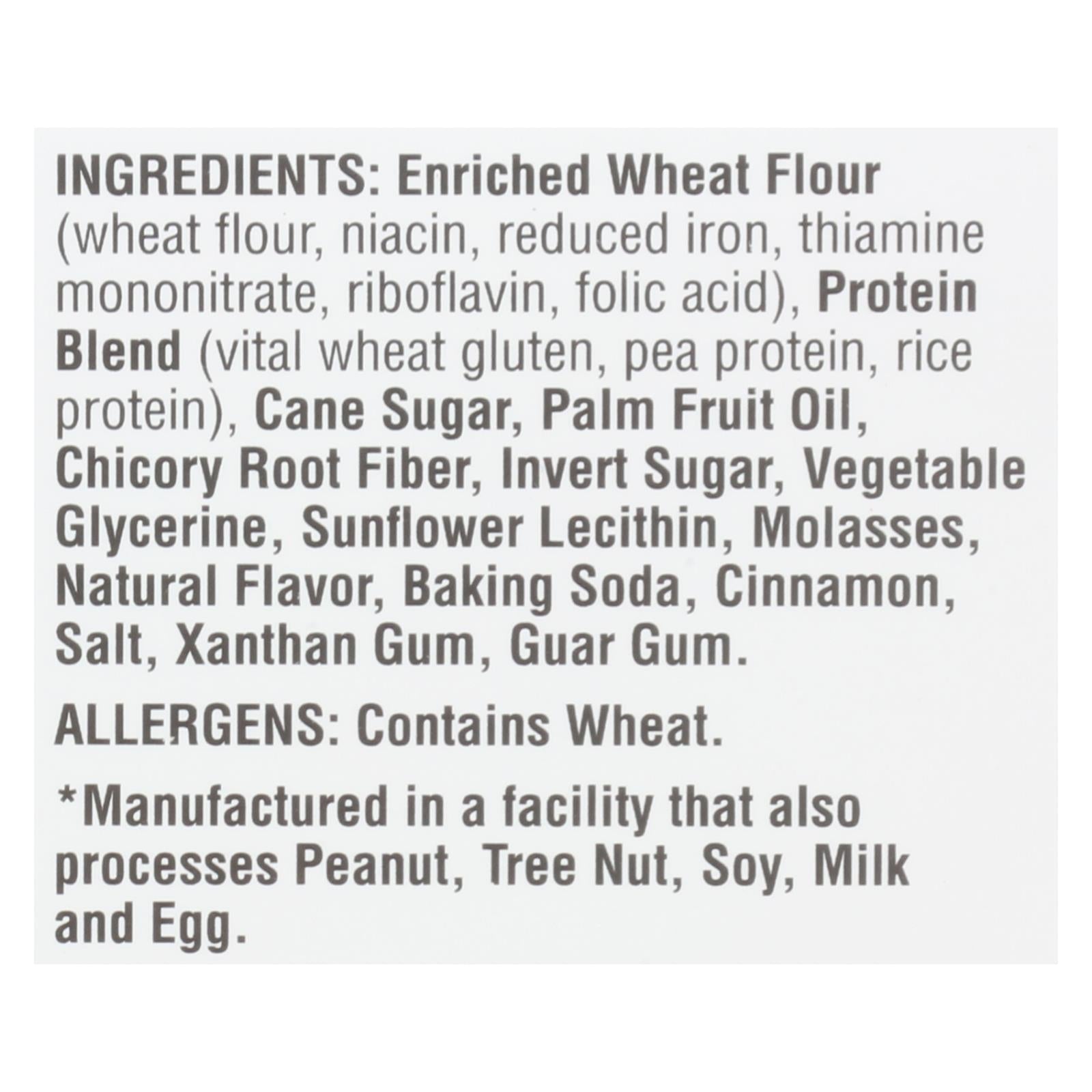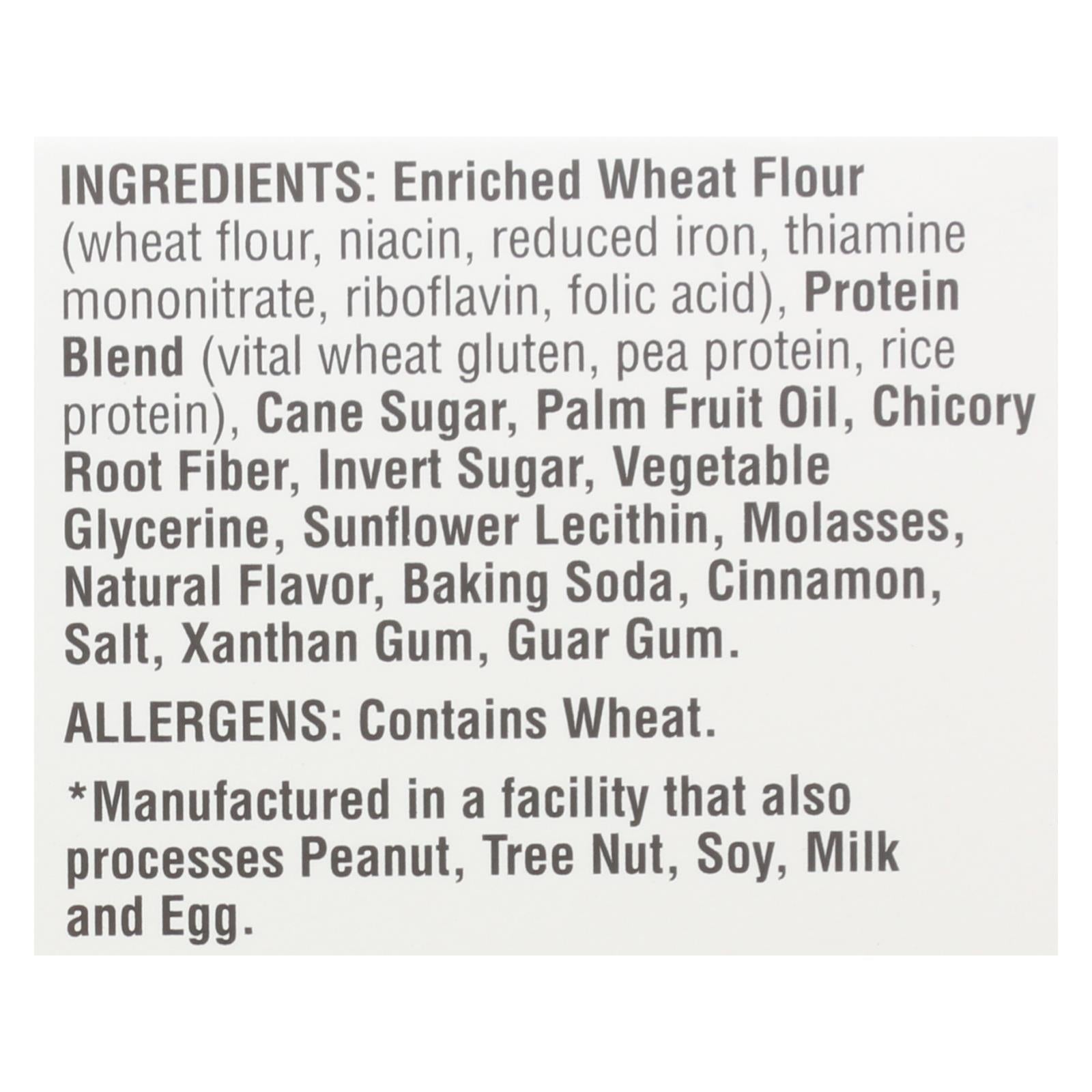 ingredients : enriched wheat flour;wheat flour;niacin;reduced iron;thiamine mononitrate;riboflavin;folic acid;protein blend;vital wheat gluten;pea protein;rice protein;cane sugar;palm fruit oil;chicory root fiber;invert sugar;vegetable glycerine;sunflower lecithin;molasses;natural flavor;baking soda;cinnamon;salt;xanthan gum;guar gum