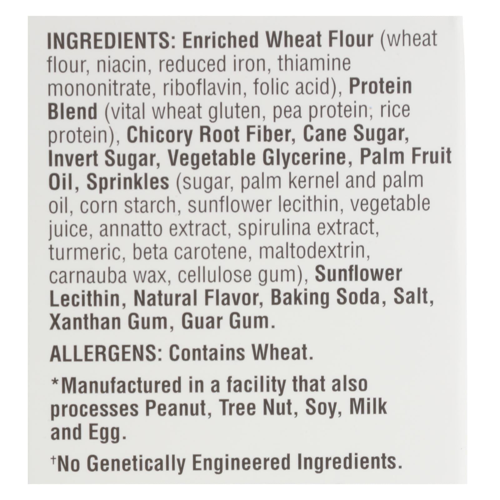 ingredients : enriched wheat flour;wheat flour;niacin;reduced iron;thiamine mononitrate;riboflavin;folic acid;protein blend;vital wheat gluten;pea protein;rice protein;chicory root fiber;cane sugar;invert sugar;vegetable glycerine;palm fruit oil;sprinkles;sugar;palm kernel and palm oil;corn starch;sunflower lecithin;vegetable juice;annatto extract;spirulina extract;turmeric;beta carotene;maltodextrin;carnauba wax;cellulose gum;natural flavor;baking soda;salt;xanthan gum;guar gum