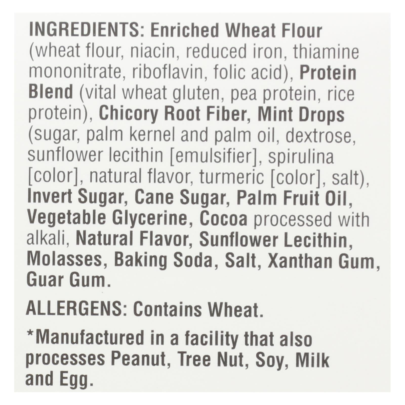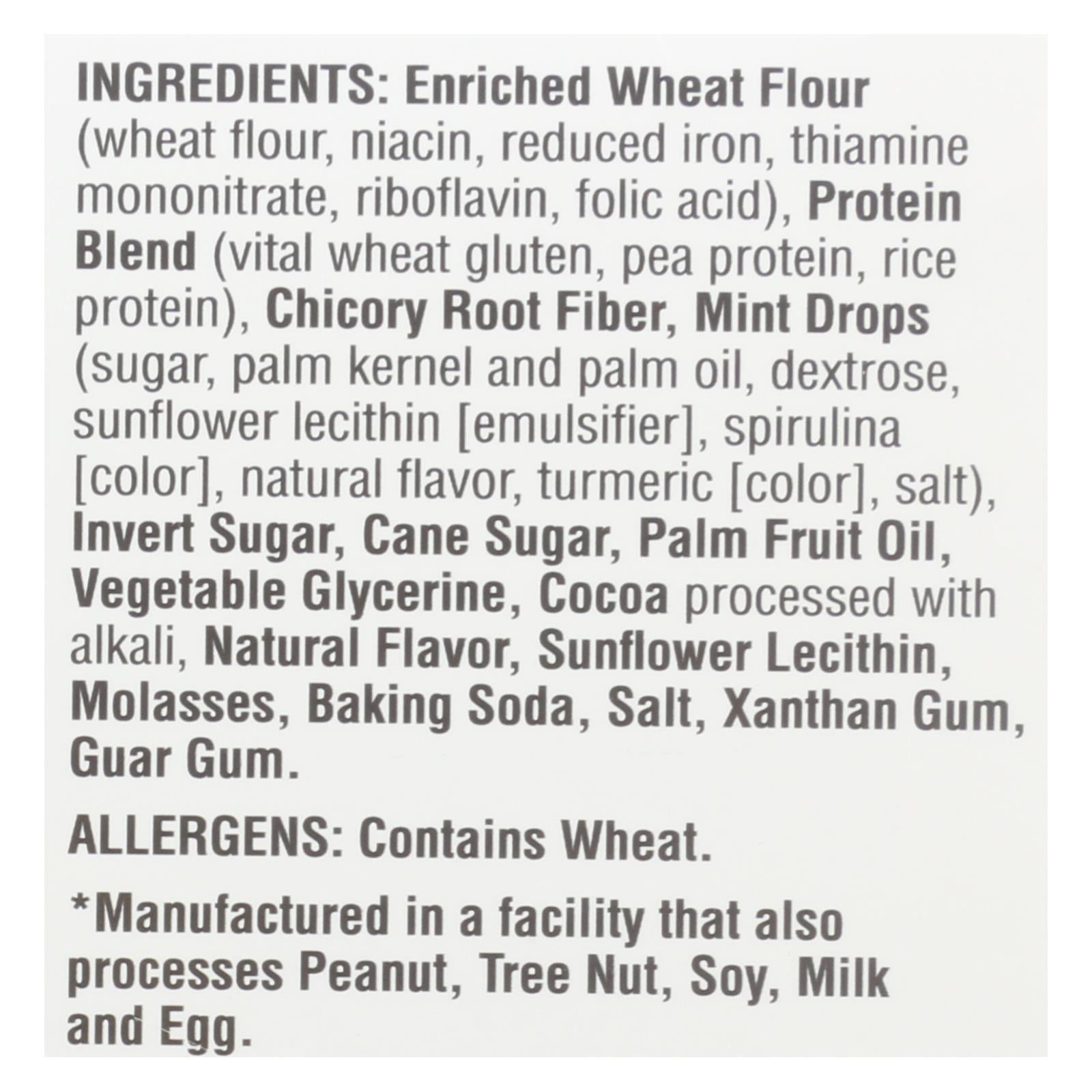 ingredients : enriched wheat flour;wheat flour;niacin;reduced iron;thiamine mononitrate;riboflavin;folic acid;protein blend;vital wheat gluten;pea protein;rice protein;chicory root fiber;mint drops;sugar;palm kernel and palm oil;dextrose;sunflower lecithin [emulsifier];spirulina [color];natural flavor;turmeric [color];salt;invert sugar;molasses;baking soda;xanthan gum;guar gum