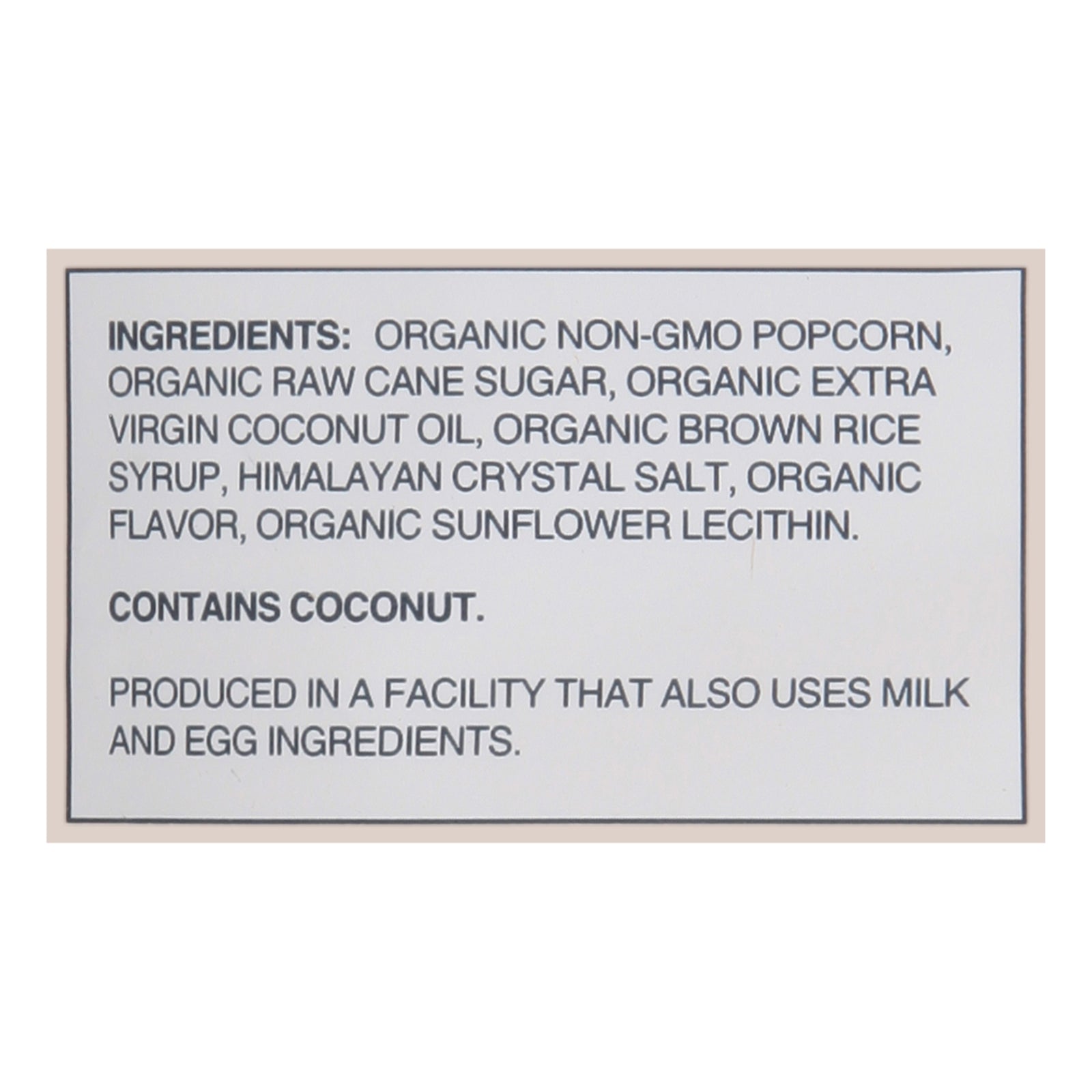 ingredients : organic non-gmo popcorn;organic raw cane sugar;organic extra virgin coconut oil;organic brown rice syrup;himalayan crystal salt;organic flavor;organic sunflower lecithin