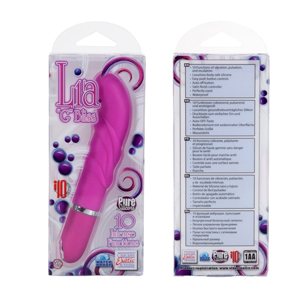 Lia G Bliss Vibrator is available in two colors: Blue and Pink. Each sold separately. Lia is for Lovers. Pure premium Silicone massagers, stimulators, and probes designed for today's discerning shopper. Only the finest of materials and components are used create this outstanding collection! New designs, new motors! Premium quality Silicone massagers with 6 styles to choose from 10 incredible functions of vibration, pulsation, and escalation. Satin Finish controller with easy push buttons. Easy to operate. Auto on/off. Safe and pure for body and pleasure. Made using phthalate free, non-toxic materials Silicone massager, buttons, ABS Plastic with Polyurethane PU Cote cap, ABS Plastic with silver plating decorative ring. Vibrator measures 4.25 inches long by 1 inch wide. Bulk weight 2.3 ounces. Vibrating sex toy requires 1 AA battery, not included. Do not leave battery in the vibrator between uses. A water based lubricant is recommended. Category: New Items, For Women, Vibrator, Vibrators. Featured in the July 2012 Supplement page 37. Lia G Bliss Pink Vibrator is a registered trademark for California Exotic Novelties.