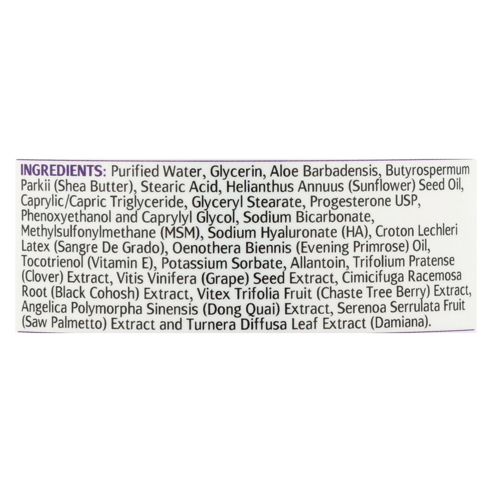 ingredients : purified water;glycerin;aloe barbadensis;butyrospermum parkii;shea butter;stearic acid;helianthus annuus;sunflower;seed oil;caprylic/capric triglyceride;glyceryl stearate;progesterone usp;phenoxyethanol and caprylyl glycol;sodium bicarbonate;methylsulfonylmethane;msm;sodium hyaluronate;ha;croton lechleri latex;sangre de grado;oenothera biennis;evening primrose;oil;tocotrienol;vitamin e;potassium sorbate;allantoin;trifolium pratense;clover;extract;vitis vinifera;grape;seed extract;cimicifuga race