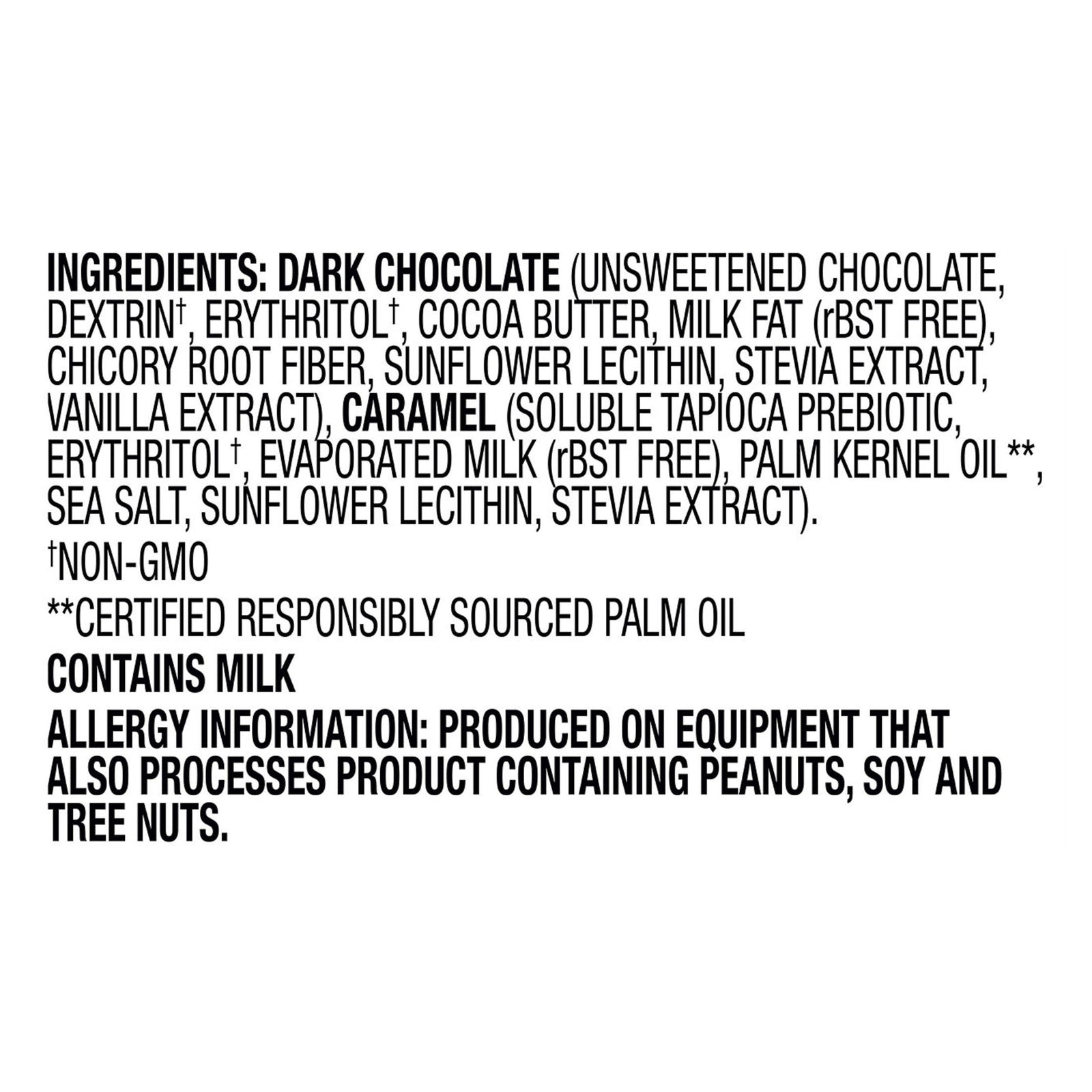 ingredients : dark chocolate (unsweetened cocoa, chicory root fiber, dextrin , erythritol , cocoa butter, milk fat (rbst free), organic soy lecithin, sunflower lecithin, stevia extract, vanilla extract);caramel (soluble tapioca prebiotic, erythritol , evaporated milk (rbst free), palm kernel oil**, sea salt, sunflower lecithin, stevia extract)