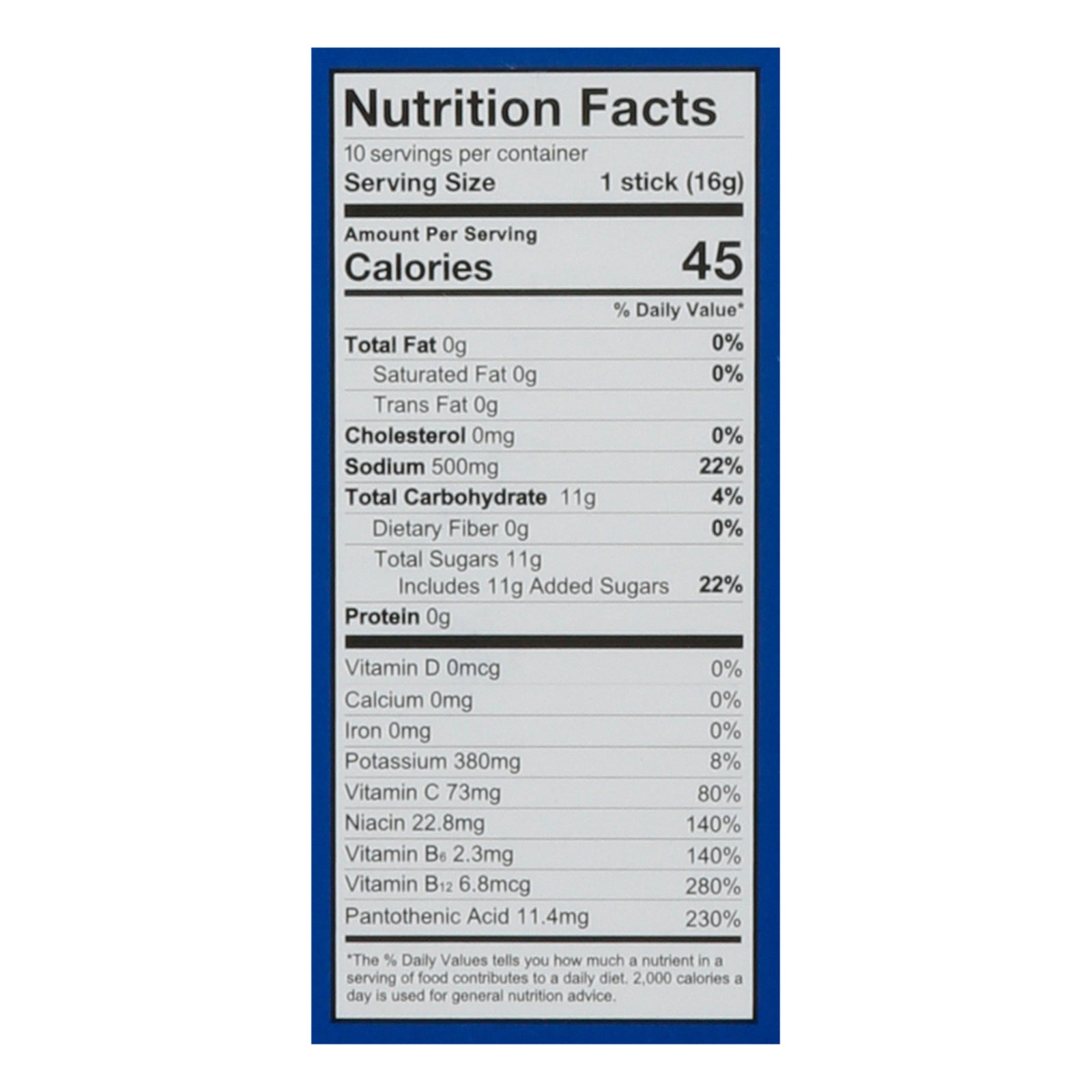 ingredients : pure cane sugar;dextrose;citric acid;salt;potassium citrate;sodium citrate;dipotassium phosphate;silicon dioxide;rebaudioside-a (stevia leaf extract);vitamin c (ascorbic acid);natural flavor;vitamin b3 (niacinamide);vitamin b5 (d-calcium pantothenate);vitamin b6 (pyridoxine hydrochloride);vitamin b12 (cyanocobalamin)