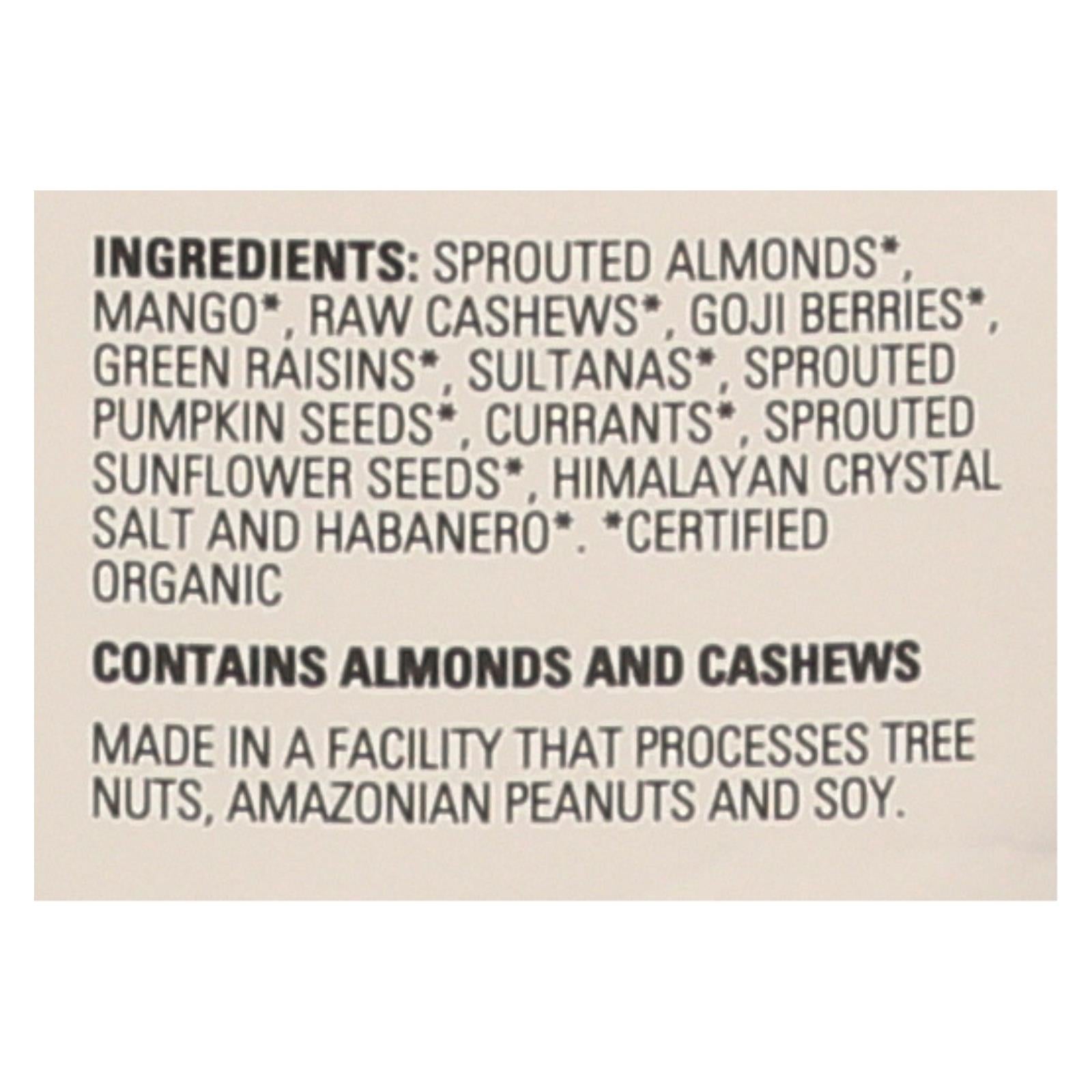 Living intentions activated spicy mango sprouted trail mix contains a lightly salted blend of habanero mango, nuts, sprouted seeds, goji berries and sweet raisins for a nutritious snack. Picked, dried and packaged at the peak of freshness, this 7 oz. Bag features certified organic ingredients to offer a sustainable energy boost in a delicious and healthy snack.