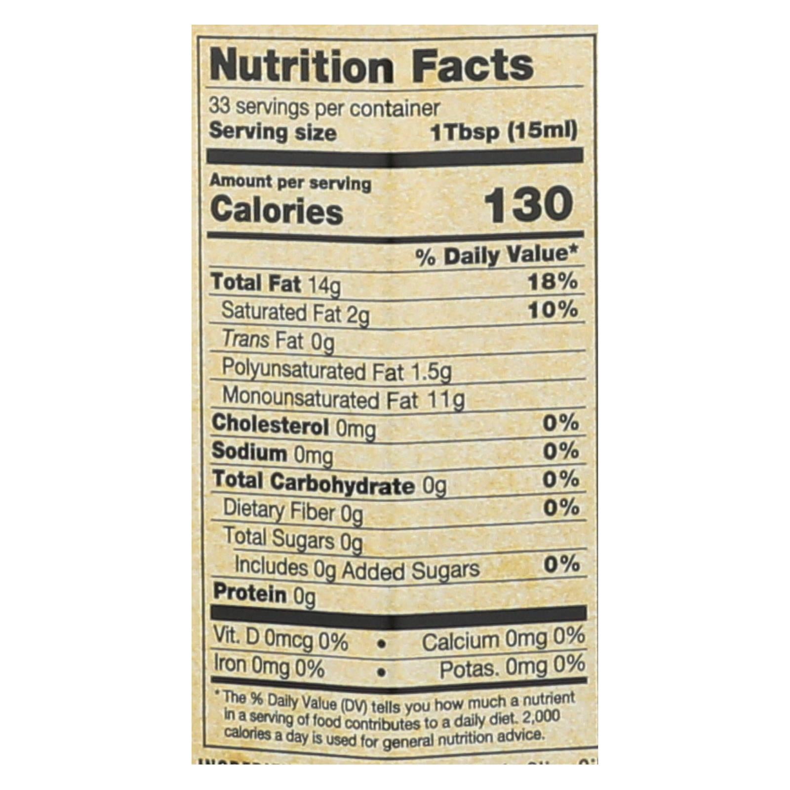 Lucini italia extra virgin olive oil is made from 100-percent organic olives for a completely gluten-free and kosher product. Each 500 ml. Container includes approximately thirty-three 1 tablespoon servings. We reach our low 0.3 to 0.5 percent acidity levels thanks to our cold-pressing techniques, which keeps the oil fresh and light for optimum taste. Our olive oil contains no sugar, cholesterol or carbohydrates, making it great for people on a variety of diets.
