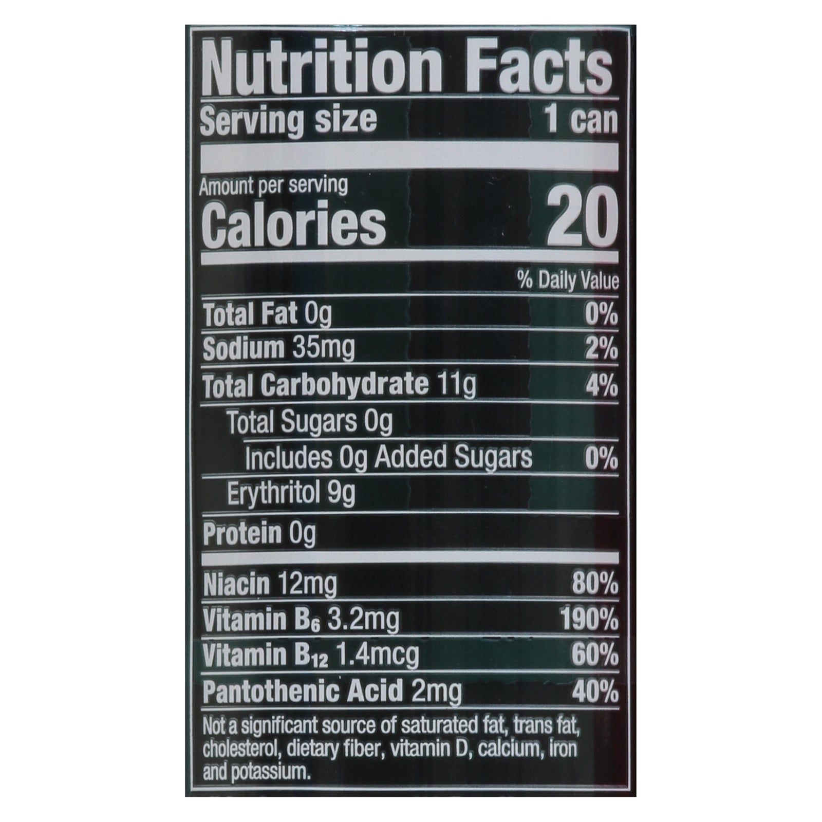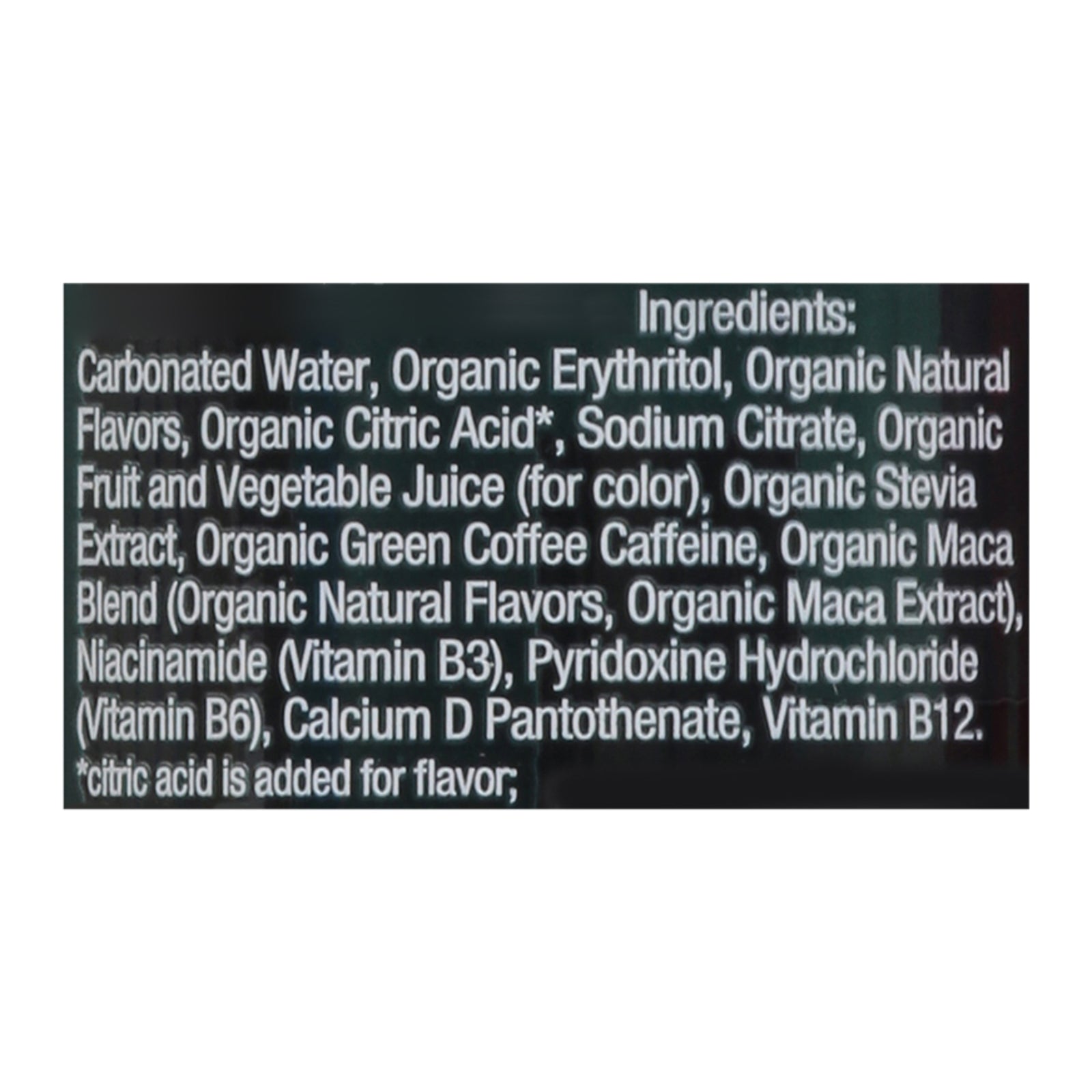 ingredients : carbonated water;organic erythritol;organic natural flavors;organic citric acid;sodium citrate;organic fruit and vegetable juice (for color);organic stevia extract;organic green coffee caffeine;organic maca extract;organic green coffee caffeine;organic maca blend (organic natural flavors, organic maca extract);niacinamide (vitamin b3);pyridoxine hydrochloride (vitamin b6);calcium d pantothenate;vitamin b12