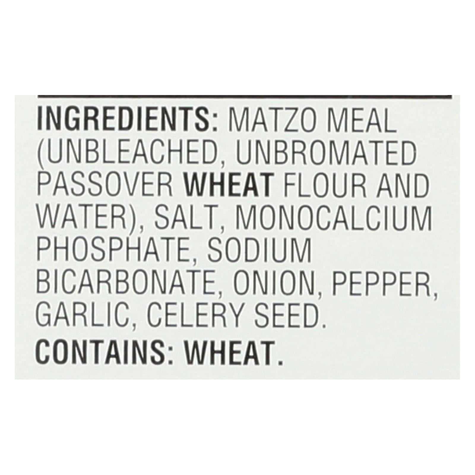 ingredients : matzo meal;unbleached;unbromated passover wheat flour and water;salt;monocalcium phosphate;sodium bicarbonate;onion;pepper;garlic;celery seed