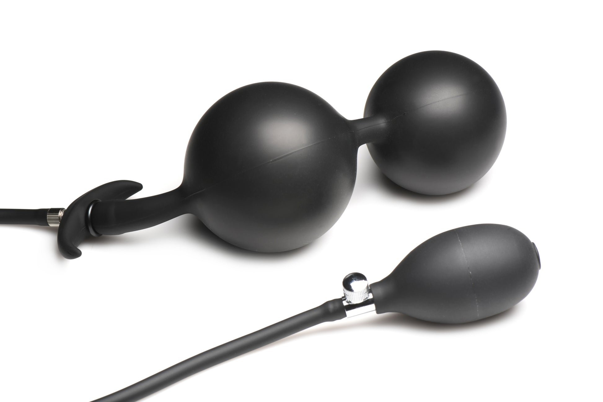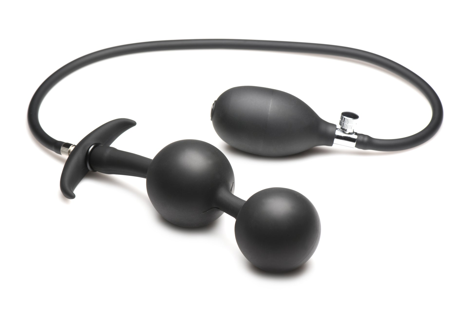 Master Series Ass Rattler Weighted Inflatable Anal Plug from XR Brands. Go deeper with your fantasies and stretch the limits of your pleasure with these weighted, inflatable Silicone Anal Beads. The two large balls are made of heavy steel and a stretchy, silky smooth Silicone covers them. Their round body can be pushed inside with the help of some lubricant and they will reach into your derriere and settle in the rectum. The cord extends out of the backdoor and has a slim, flanged base that is perfect for long play sessions and comfortable wear. However, the real excitement begins when you use the soft, easy to use, bulb hand pump and inflate these round, weighted balls from 1.2 inches wide to 2.8 inches wide! As they expand, you can feel them adding pressure and sensation to your A-Spot or P-Spot. You control the pressure and the release with the built in, quick release valve that lets you deflate fast or slow. After insertion and inflation, you can remove the hose and the plug will remain inflated. Enjoy the downward pull of gravity as it gently tugs on the steel balls in your derriere. All other sensation and touch nearby will be enhanced by the added pressure from this sensual, sexy plug! Simply begin by adding lots of lube, popping one ball in and then the next. Once they are both inside, slowly inflate to the degree you are comfortable with. Detach the hose and keep that pressure while you play with yourself or a partner! After use, simply wash with warm water and mild soap, then spray with a toy cleaner and let air dry. Use only with water based lubricants. Measurements: overall length: 28.75 inches. Deflated: 5.1 inches insertable length, 1.2 inches widest insertable diameter. Inflated: 8 inches insertable length, 2.8 inches widest insertable diameter. Plug alone weighs 3.6 ounces. Materials: Plug: Silicone Weighted balls: Steel Hose and bulb: PVC, Metal. Color: Black. Note: use only with water based lubricant. Key features: