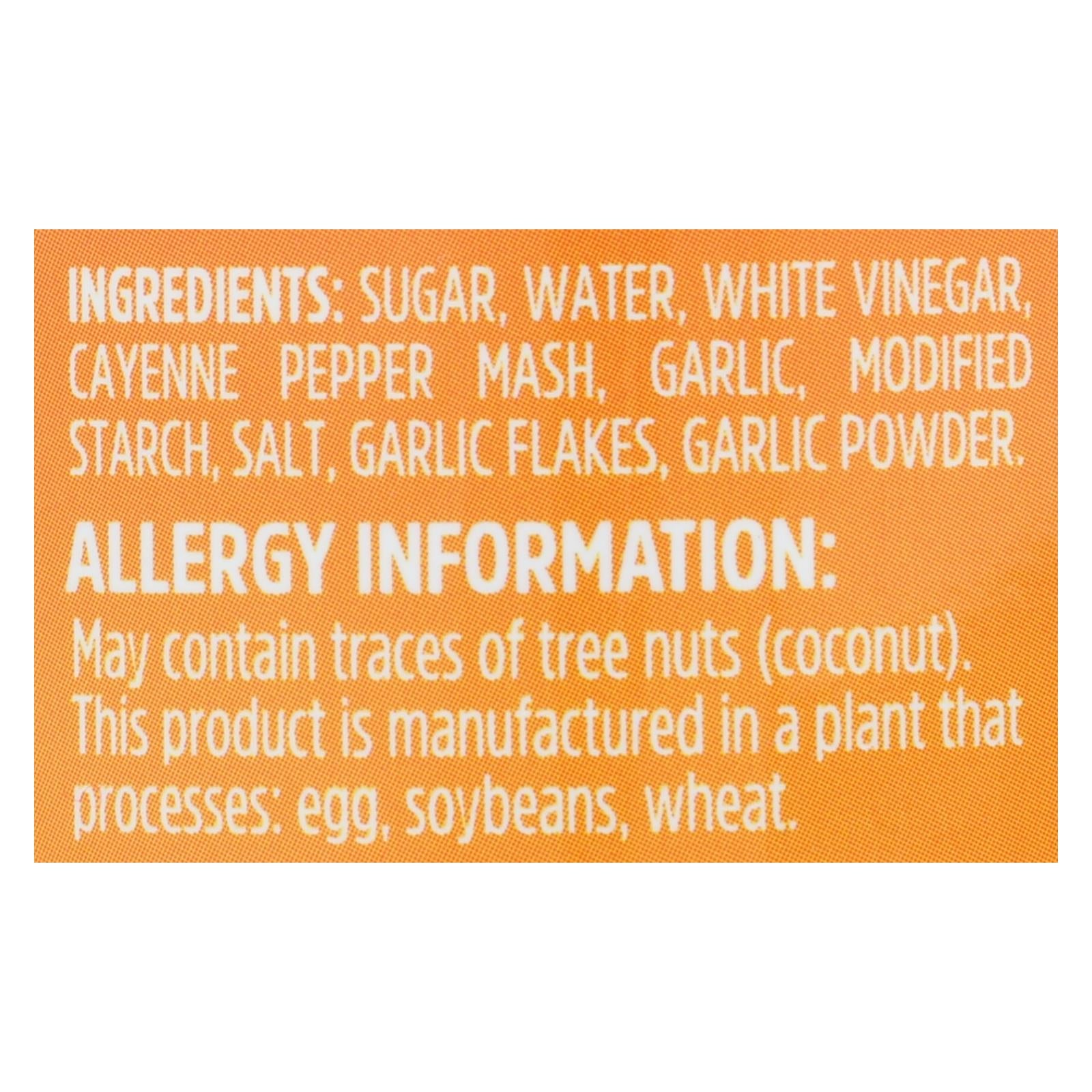 ingredients : sugar;water;white vinegar;cayenne pepper mash;garlic;modified starch;salt;garlic flakes;garlic powder