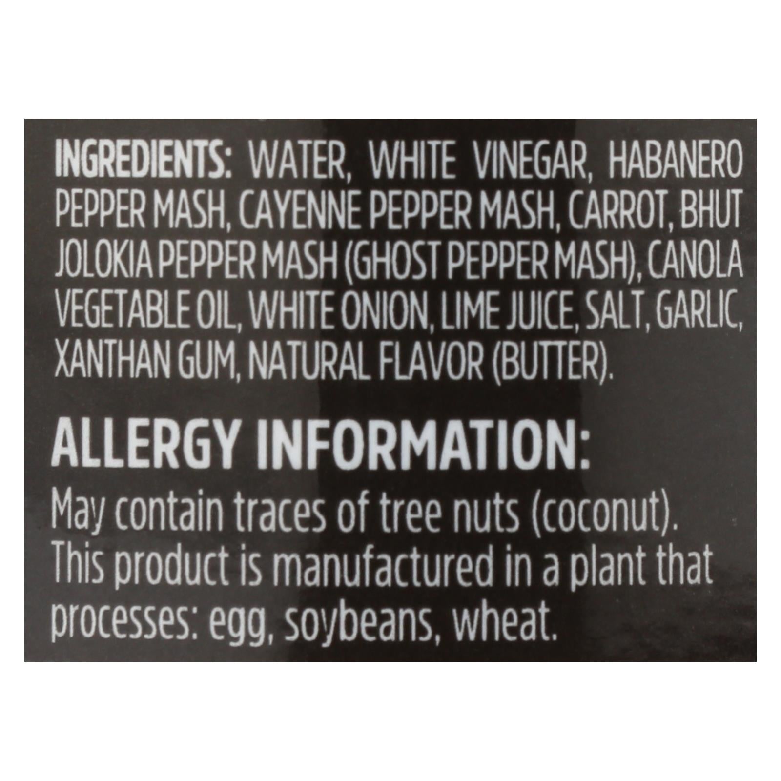 ingredients : water;white vinegar;habanero pepper mash;cayenne pepper mash;carrot;bhut jolokia pepper mash;ghost pepper mash;canola vegetable oil;white onion;lime juice;salt;garlic;xanthan gum;natural flavor;butter