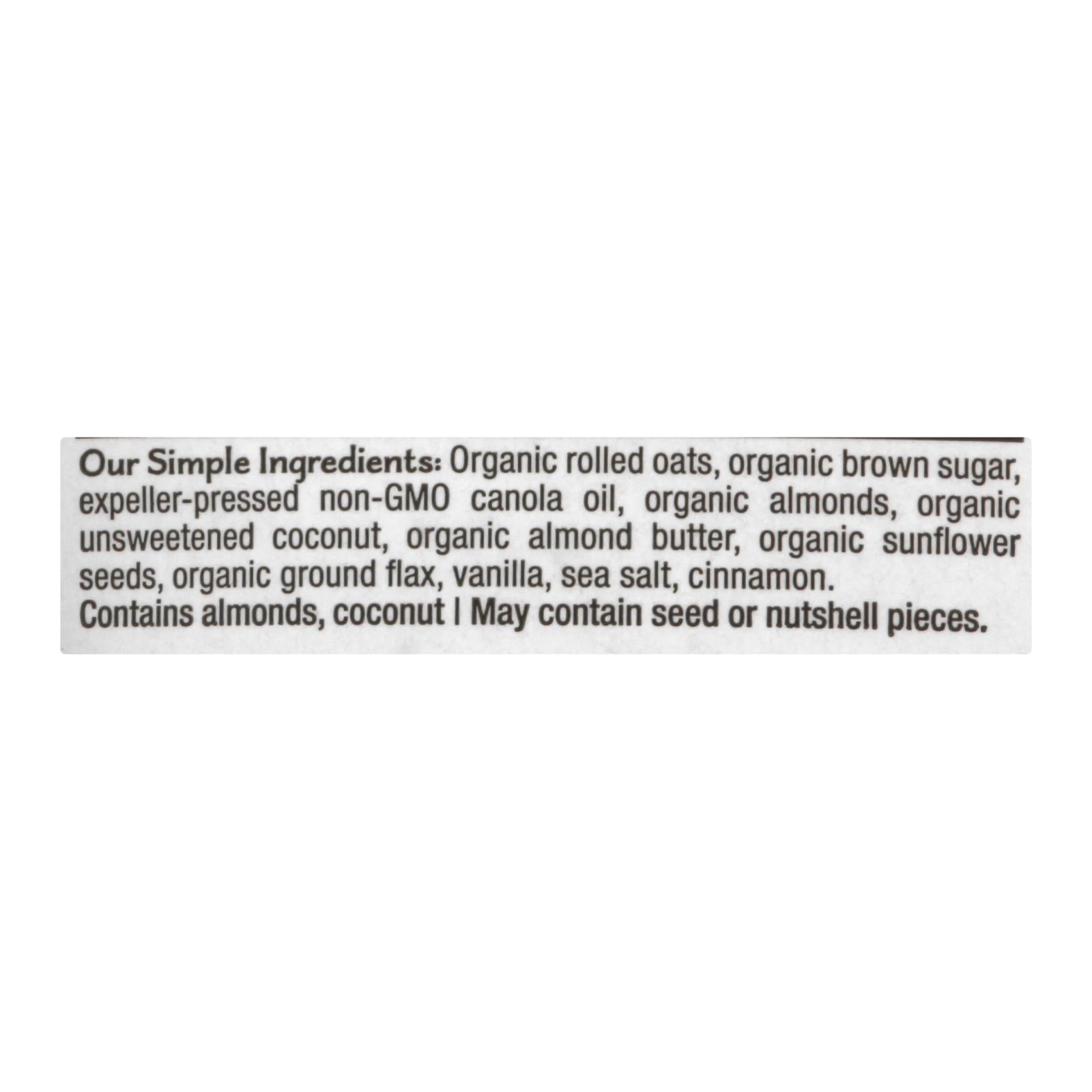 ingredients : organic gluten-free oats;organic brown sugar;expeller-pressed non-gmo canola oil;almonds;organic unsweetened coconut;almond butter;organic sunflower seeds;organic ground flax;pure vanilla extract;sea salt;cinnamon