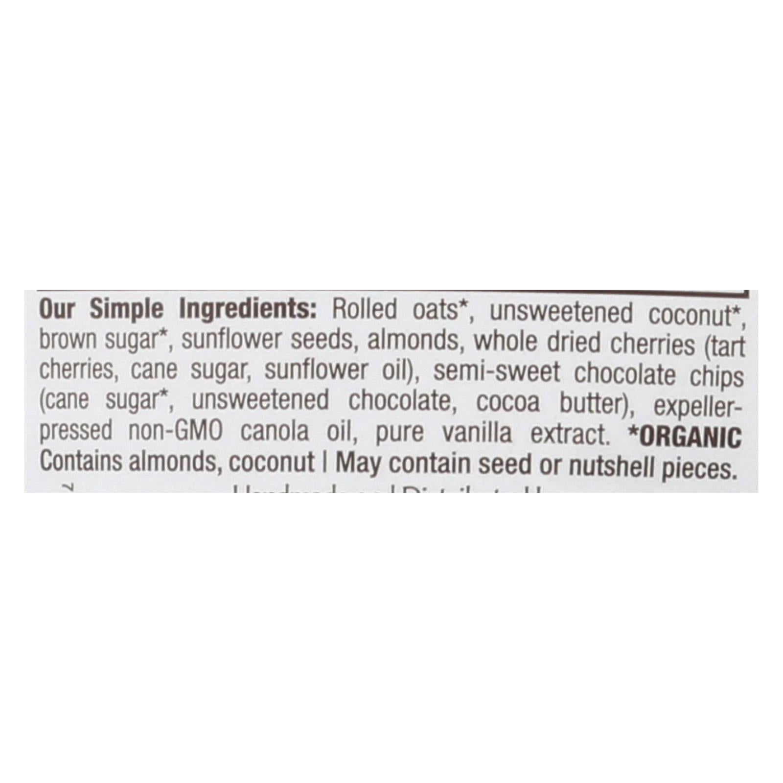 ingredients : organic gluten-free oats;organic brown sugar;expeller-pressed non-gmo canola oil;organic sunflower seeds;organic unsweetened coconut;dried cherries;tart cherries;cane sugar;sunflower oil;almonds;semi-sweet chocolate chips;organic cane sugar;unsweetened chocolate;cocoa butter;pure vanilla extract