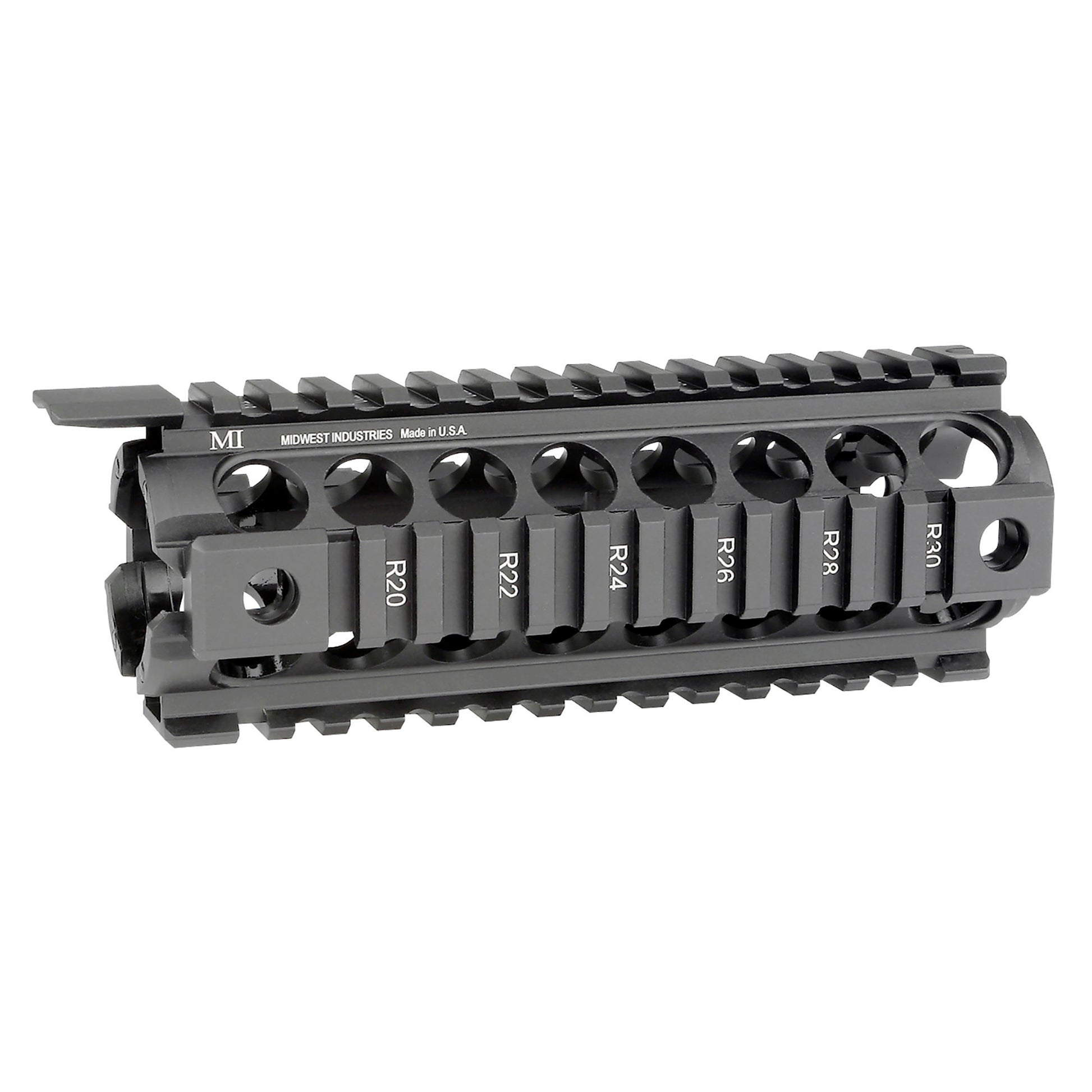 Midwest Industries Carbine Length MI Gen2 Two Piece Drop-In-Handguard installs like factory plastic handguards. Midwest Industries is a proven leader in the firearm industry. Made in America, focusing on the small details to make your rifle platform better. The addition of their drop in handguard to your rifle platform creates the rail space you need to add your accessories. It has Gen2 design with four anti-rotation QD sockets for push button swivels. It is constructed from 6061 aluminum hard coat anodized and compatible with most gas piston systems.