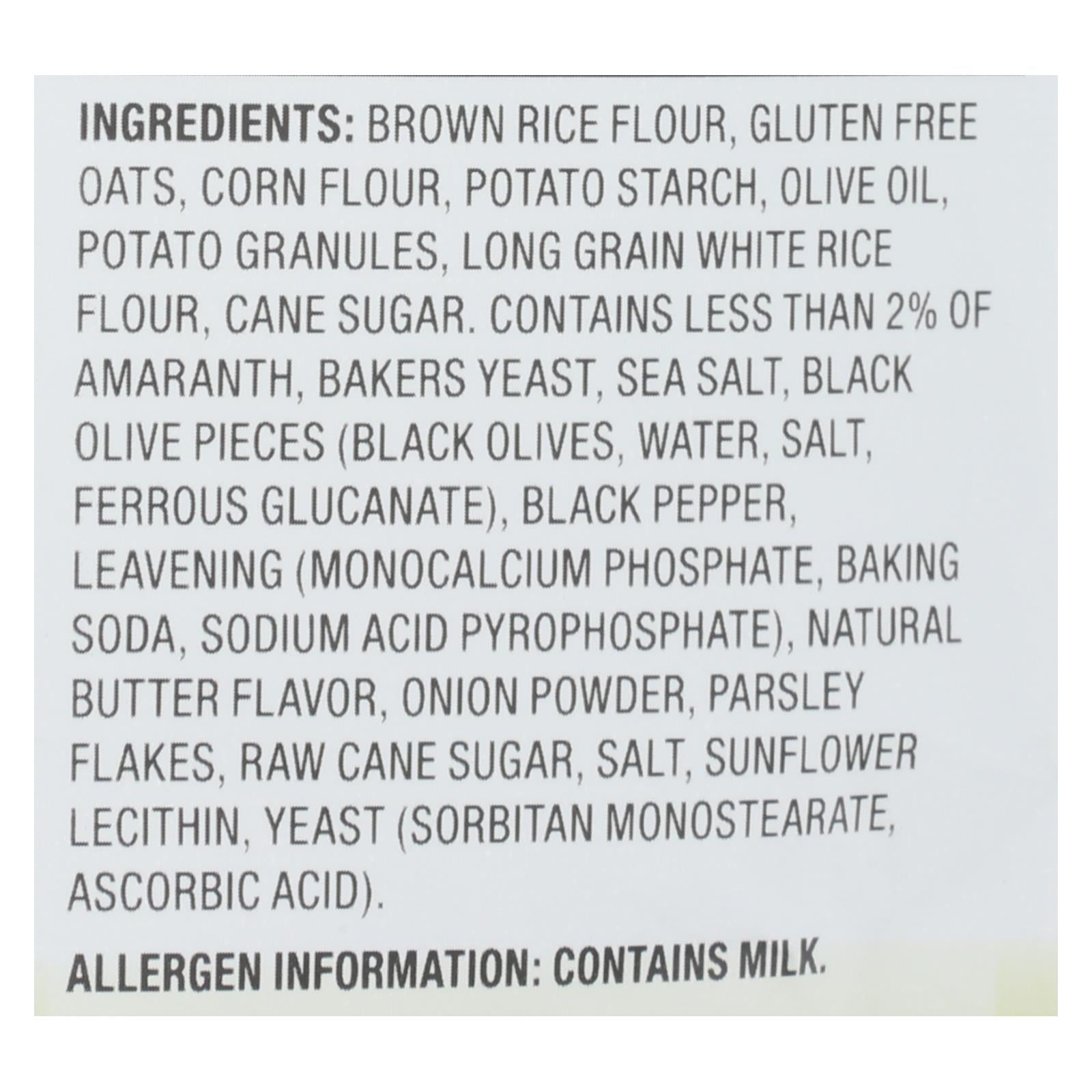 ingredients : brown rice flour;gluten free oats;corn flour;potato starch;olive oil;potato granules;long grain white rice flour;cane sugar. Contains less than 2% of amaranth;bakers yeast;sea salt;black olive pieces;black olives;water;salt;ferrous glucanate;black pepper;leavening;monocalcium phosphate;baking soda;sodium acid pyrophosphate;natural butter flavor;onion powder;parsley flakes;raw cane sugar;sunflower lecithin;yeast;sorbitan monostearate;ascorbic acid