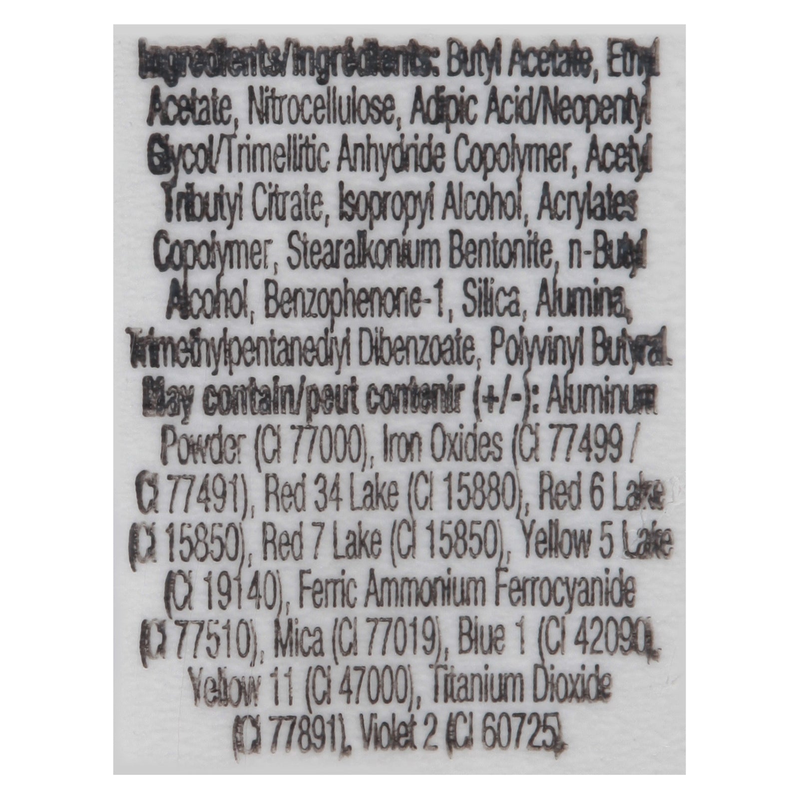 ingredients : butyl acetate;ethyl acetate;nitrocellulose;adipic acid/neopentyl glycol/trimellitic anhydride copolymer;acetyl tributyl citrate;isopropyl alcohol;acrylates copolymer;stearalkonium bentonite;n-butyl alcohol;benzophenone-1;silica;alumina;trimethylpentanediol dibenzoate;polyvinyl;butyral. May contain;+/-;: aluminum powder;ci 77000;iron oxides;ci 77499 / ci 77491;red 34 lake;ci 15880;red 6 lake;ci 15850;red 7 lake;yellow 5 lake;ci 19140;ferric ammonium ferrocyanide;ci 77510;mica;ci 77019;blue 1;ci4