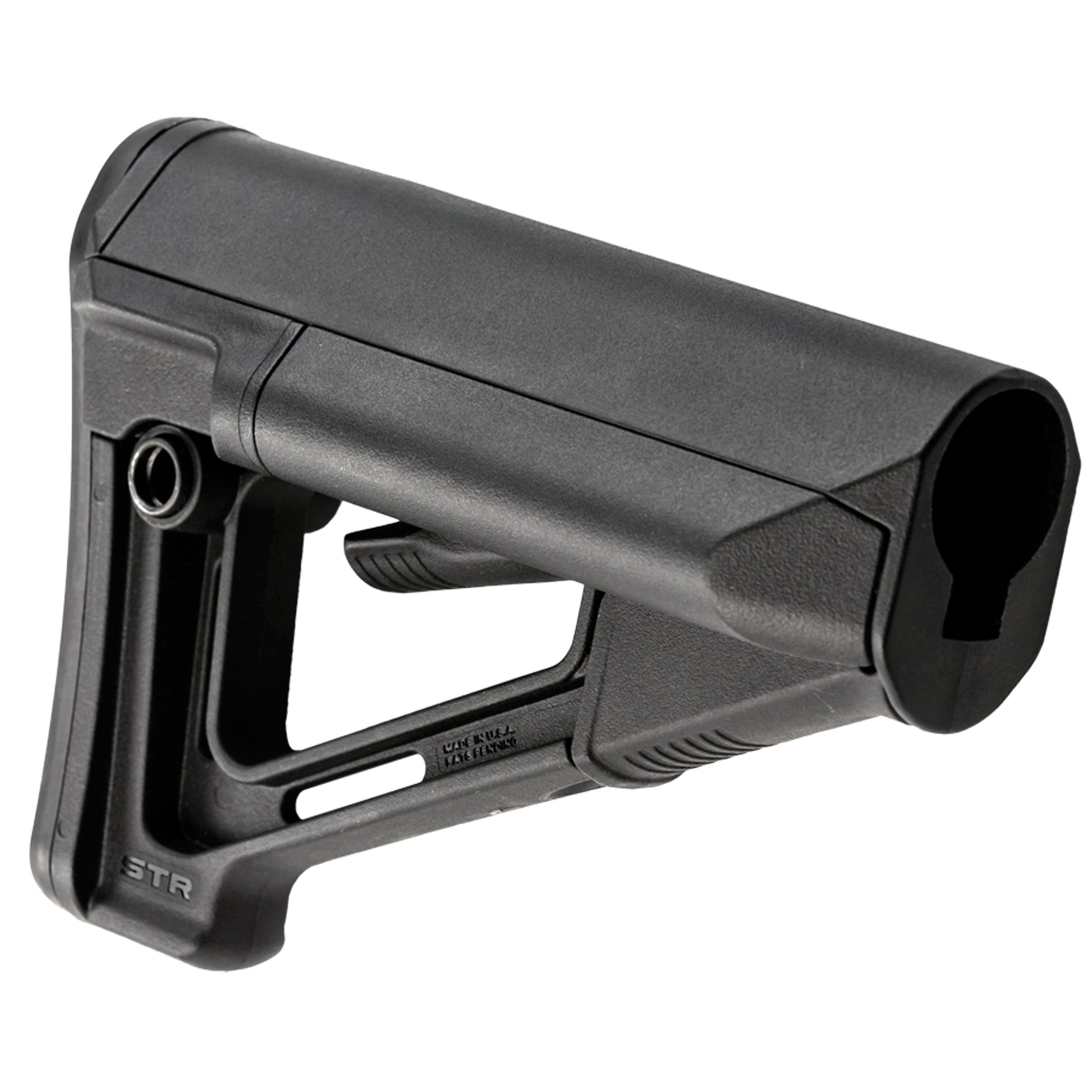 The Magpul STR (Storage/Type Restricted) is a drop-in replacement buttstock for AR15/M4 carbines using mil-spec sized receiver extension tubes. A storage-capable version of the CTR(R)" the STR has improved cheek weld and two water resistant battery tubes on a compact" reinforced polymer A-frame design. A shielded operation lever and supplemental friction locking system prevent accidental operation and minimize excessive stock movement for enhanced weapon stability and accuracy.* The STR incorporates two integral sling loops" a reversible push-button QD sling mount" and a replaceable 0.30" thick rubber butt-pad which provides positive shoulder purchase to prevent slippage even with body armor or modular gear. Made in U.S.A.