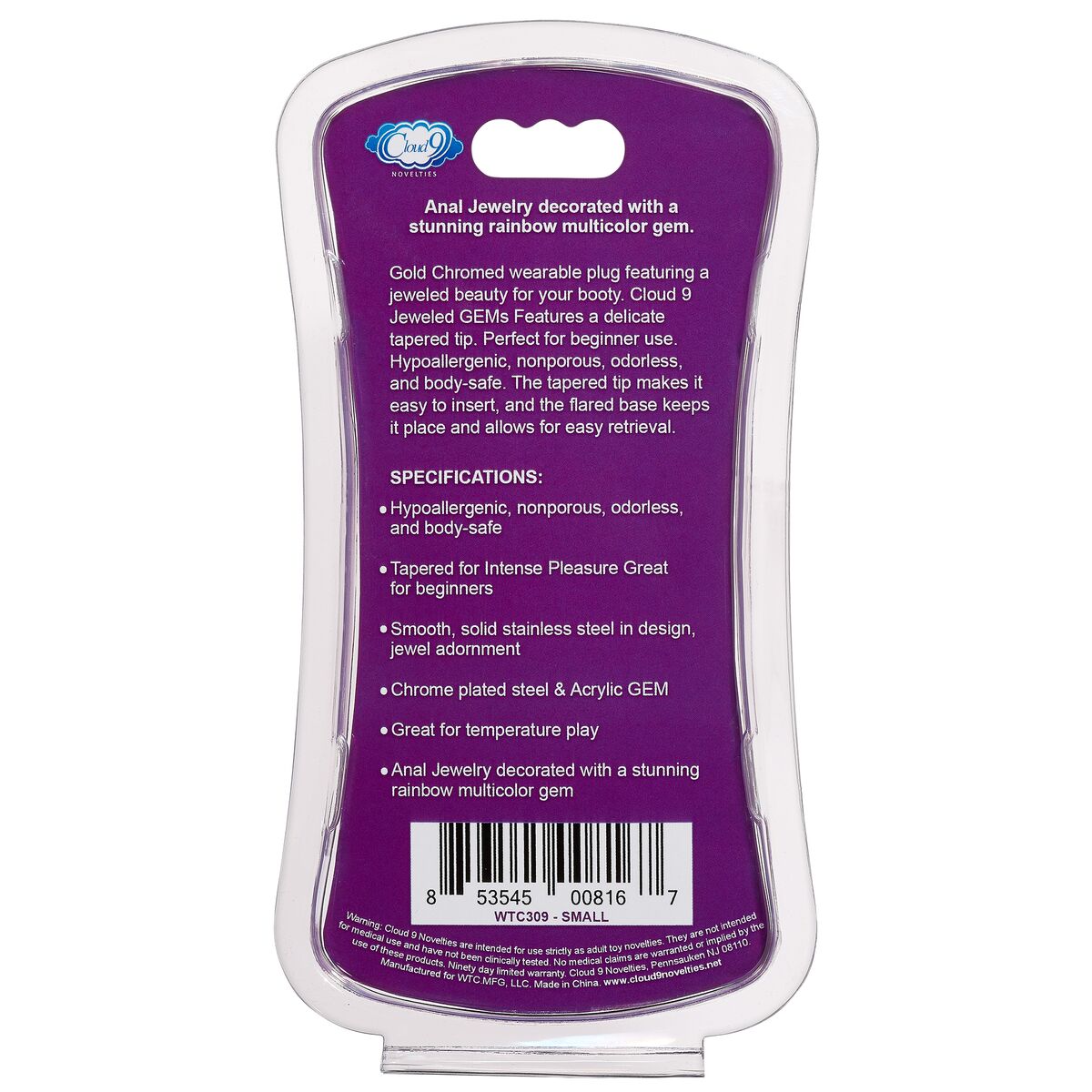 Cloud 9 Gems Gold Anal Plug . Anal Jewelry decorated with a stunning rainbow multicolor gem. Gold Chromed wearable stainless steel plug featuring a jeweled beauty for your booty. Cloud 9 Jeweled Gems